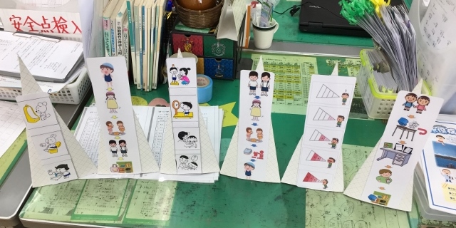 子ども達がいない夏休み、先生方は、資質・能力を向上させるために、校外である研修にたくさん参加しています。出勤している先生は、計画的に、9月からの授業準備や見学旅行などの計画立案をしたり、教材作成等をしたりして、登校してくる子ども達を迎える準備をしています。下の写真は、昨日、机上においてあったものを撮影しました。低学年の子ども達に、行動の仕方を効果的に伝えるための提示物です。