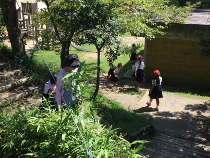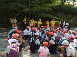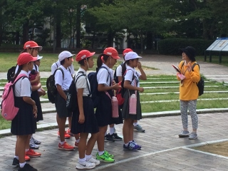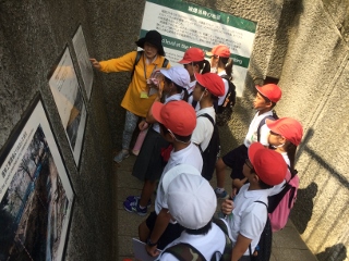 9月6日(水) 資料館見学の後は、フィールドワークです。真剣に話を聞いて学んでいる様子がうかがえます。山里小学校の校舎も見えます。