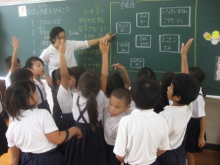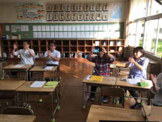 9月22日(金) 校内研修でした。情報漏洩の不祥事防止研修の後、9月29日に行う研究授業5年生外国語活動の指導案検討と模擬授業を行いました。先生たちが子どもの役をしながら、授業が活性化するにはどうしたらよいか検討しました。写真は模擬授業の様子です。