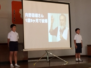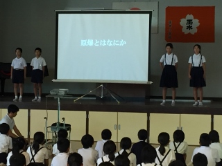 9月25日(月) 6年生の発表の中で、語り部の方の言葉が印象的だったので、紹介します。「原子爆弾は、憎んでも憎みきれません」「戦争で犠牲になるのは、女性や子どもです」「戦争はしてはいけません」そして「命は大切なものです」「皆さん仲良くしてください」「いじめなんてもってのほかです」「みんなが仲良くすること。それが世界平和につながるのです」これらの発表を受けて、3人の子ども達が、返しの言葉を返してくれました。最後に担当から、子ども達の平和への願いを綴った作文の紹介があり、集会を終えました。子ども達は、きっと自分たちの学校生活の中にいかしてくれると思います。