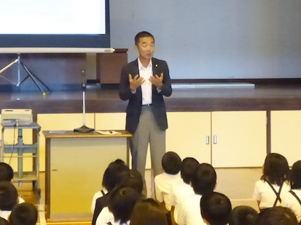 朝から体育館で、後期の始業式があり、校長先生の話と児童代表の発表がありました。