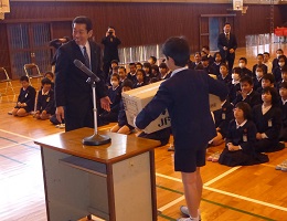小学校の1年間の最後の修了式が体育館で行われました。