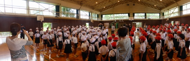 玉水小学校に英語を教えにきてもらっているケーシー先生が今日の最後の授業でした。そこで、体育館で子ども達とのお別れの式をしました。お別れの式で、ケーシー先生が子ども達に挨拶をされ
