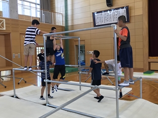 8月5日(日)6年生の学年活動です。昼間は、天水中学校でトランポリンやパルクールを行いました。初めての子供達もとても上手にできていました。みんな楽しそうに活動していました。お世話をされた係の方は、大変お疲れ様です。