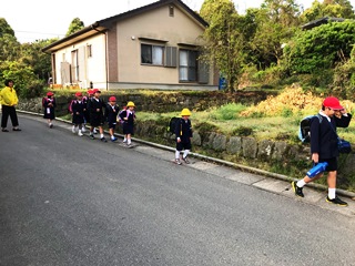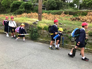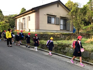 4月11日(水)今日は、一年生の初めての集団登校でした。上級生もお兄さんお姉さんとしてしっかりサポートしていました。交通指導員さん、民生児童員さん、主任児童員さん、学校職員で見守る中、安全に登校できていました。
