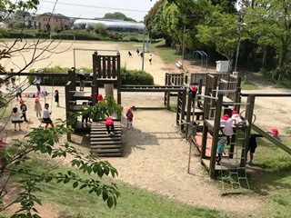 4月16日(月) 業間の様子です。玉水保育園からたくさんの園児が遊びに来ました。とてもかわいいです。1年生もシーソーで楽しく遊んでいました。同じ保育園だった子供達は、再会を喜んでいる子もいました。