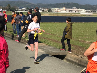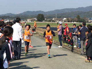 3月11日(日)金栗駅伝大会がありました。天水町のチームは練習の成果を発揮し、男女とも優勝しました。最後は男子が1位でゴールした場面の写真です。