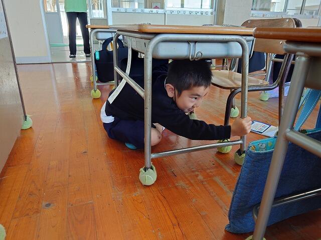 子供たちは、地震対策として机の下にもぐり、避難中は頭を教科書などで守りながら移動しました。