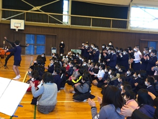 本当に楽しい演奏会でした。後半は、演奏している場所の近くに呼んでいただき迫力を感じることができました。また、1年生と6年生に指揮の体験もさせていただきました。くまモンのぬいぐるみも、子どもたちは大喜びでした。雰囲気を味わってください。