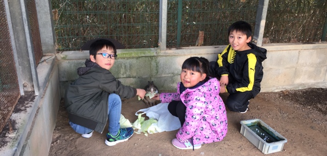 12月25日(月) 午後、子どもたちが、ウサギのお世話に来てくれていました。当番ではなく、自主的なものです。横浜から遊びに来ている親戚のいとこも一緒に来てくれていました。ウサギもうれしそうにキャベツを食べていました。お世話ありがとう。