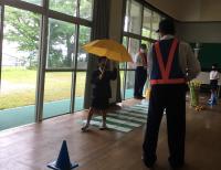 あいにくの雨で運動場での交通教室はできないので、体育館と多目的ホールに