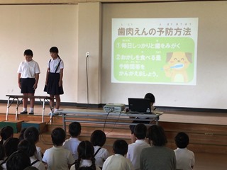 10月2日(火) 3校時にすこやか教室がありました。保健委員会のメンバーが、昼休みや委員会活動の時間を使って準備をしてきたものです。保健委員会は、増田先生の指導の下、玉水小の子供達の課題を知り、その改善のためにどんなことに取り組むかを考え、実践をしてくれています。夏休み前には、歯磨きパトロールや歯の健康についての紙芝居・本の読み聞かせなどにも取り組んできました。本校で目指している「考動力」につながるものです。発表も児童が主体となったすばらしいものでした。発表に対する返しの言葉もしっかり返してくれました。