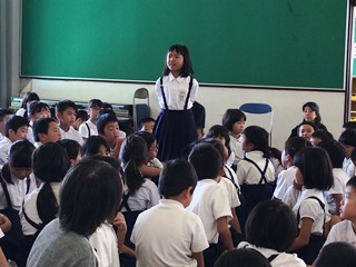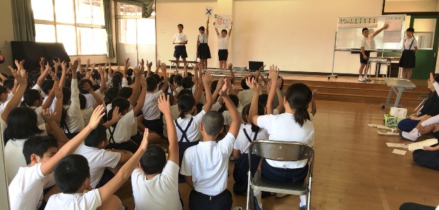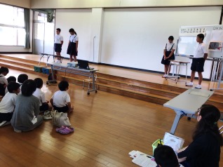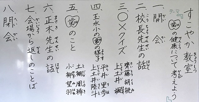 10月2日(火) 3校時にすこやか教室がありました。保健委員会のメンバーが、昼休みや委員会活動の時間を使って準備をしてきたものです。保健委員会は、増田先生の指導の下、玉水小の子供達の課題を知り、その改善のためにどんなことに取り組むかを考え、実践をしてくれています。夏休み前には、歯磨きパトロールや歯の健康についての紙芝居・本の読み聞かせなどにも取り組んできました。本校で目指している「考動力」につながるものです。発表も児童が主体となったすばらしいものでした。発表に対する返しの言葉もしっかり返してくれました。