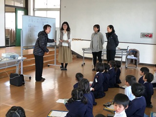 1月26日(金) 3・4校時 1年生2年生が玉水保育園との交流を行いました。自分たちで、準備したゲームやおもちゃを使って保育園のお友達を楽しませていました。子どもたちの表情が生き生きしていたのが印象的でした。写真はその様子です。