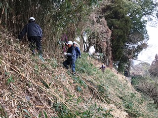 2月2日(金)今日と月曜日の2日間で、校舎北側斜面の整備が行われます。前回の作業でとても見晴らしがよくなり、周りからも校舎が見えるようにもなっていました。それで終わりと聞いていたのですが、玉名市のお計らいで、再度残りの一部を整備してもらえるようになりました。シルバー人材の方5名が作業を行われています。急な斜面での作業でとても大変です。本当にありがとうございます。写真は作業の様子です。