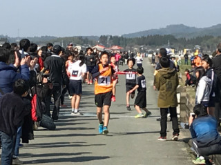 3月11日(日)金栗駅伝大会がありました。天水町のチームは練習の成果を発揮し、男女とも優勝しました。最後は男子が1位でゴールした場面の写真です。