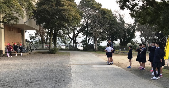 2月13日(火)今日からあいさつ運動でした。小山・久島の子供達が北坂登り口で行いました。玄関前では、立花の子供達です。写真は、北坂登り口の様子です。