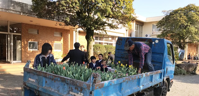 3月28日(水)今日、立花西の山本区長様よりチューリップの鉢をたくさんいただきました。入学式に大切に使わせていただきます。大変ありがとうございました。