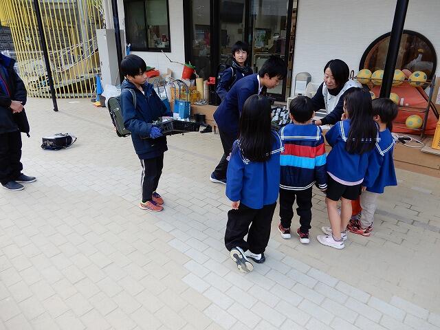 近くの保育園には、本校児童が利用する学童保育の施設もあります。本校児童がお世話になっているお礼として贈りました。保育園では、4人の園児が代表として受け取ってくれました。