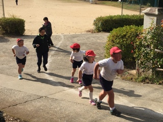 12月11日(月) 2校時1・2年生は「持久走、なわとび」の授業でした。冷たい風が吹く寒い中、子どもたちは、自分のペースを工夫しながら取り組んでいました。持久走大会へ向けて、朝や休み時間も走りながら、目標達成のために取り組んでいます。写真は持久走で、上り坂を走っている様子です。