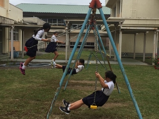 10月19日(木) 昼休み 校舎周りを見回っていると、多くの子ども達が、運動場で遊んでいる中、珍しい石を集めて遊んでいる2人の児童とブランコでパフォーマンスをしている4年生児童がいました。とても楽しそうに遊んでいました。今日はブランコをしている子ども達の写真です。