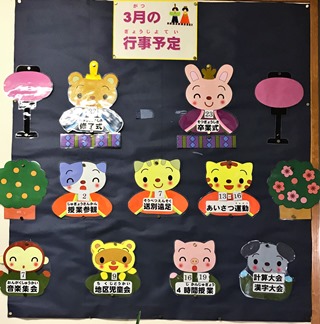 3月1日(木)校内掲示板に3月行事が貼られていました。季節感のある楽しい掲示です。いつもありがとうございます。
