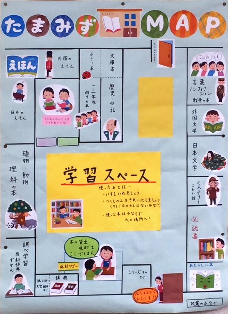 10月12日(木) 今日は、玉水小学校の図書室マップを紹介します。図書室の中にどんな本が、どこにあるか分かるように図書室マップが作ってあります。子ども達が本を探すときの参考になります。図書室補助員の内村先生の作成です。ありがとうございます。