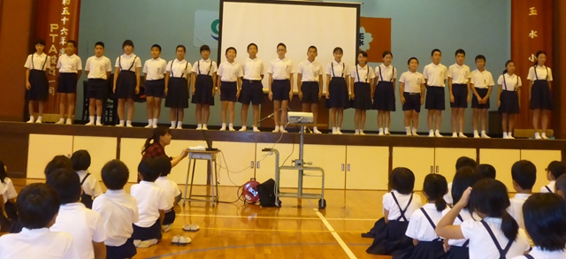 9月26日(水) 児童集会で、6年生が修学旅行で学んだことをまとめて発表しました。戦争の悲惨さや平和の尊さの学びを中心に発表してくれました。返しの言葉もしっかり返してくれました。きっとこの学びをこれからの生活に生かしてくれることだと思います。