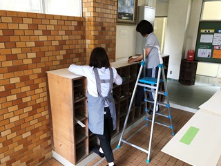 10月4日(木) 玉水小学校の2年生の靴箱の天板が、壊れかけていました。そこで、教頭先生と事務職員の西村先生が、修理をしてくださいました。おかげで天板がきれいになりました。ありがとうございました。