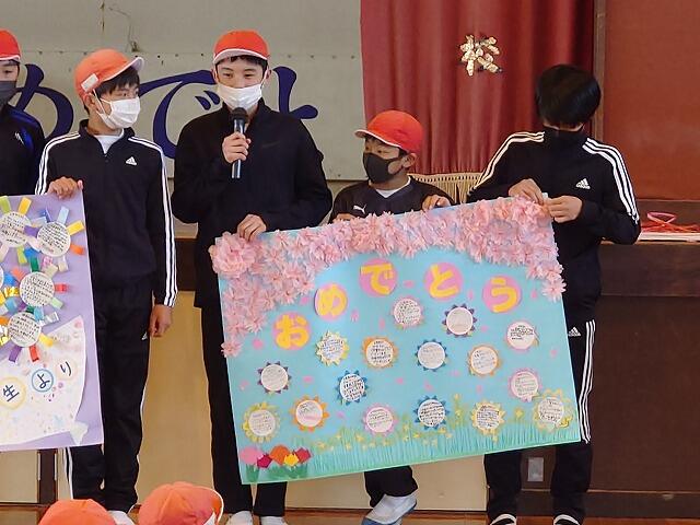 その後は、各学年からの寄せ書きを6年生に送りました。6年生からは、「かわいい!」「すごーい!」などの声が聞こえてきました。