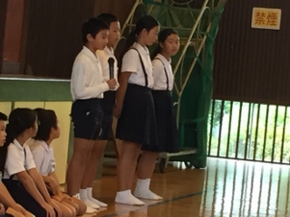 9月6日(水) 今日は前期終業式でした。玉水小学校の「めざす児童像」の3つとその姿に必要な力「やりぬく力」「共感力」「考動力」の三つを子ども達の通知表のコメントを紹介しながら説明しました。その後、各学年代表が前期の反省と後期の目標を発表し、最後に全員で校歌を歌って終了しました。参加の態度は、素晴らしい態度で話の聞き方もとても良かったです。写真は、その様子です。