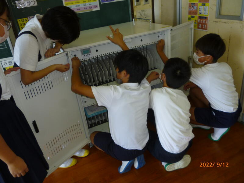 アダプターは、タブレットPC保管庫に接続してあり、簡単には外すことができません。そこで、5,6年生の児童に「アダプター外し隊」を募集しました。「アダプター外し隊」の任務は、1,2,3年生のアダプターを外して持ち帰りができるようにすることです。担任が、呼びかけをするとすぐにメンバーが集まりました。