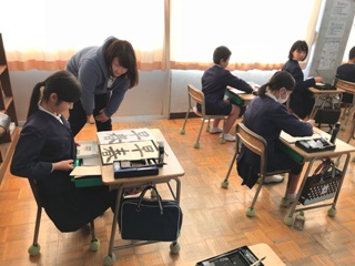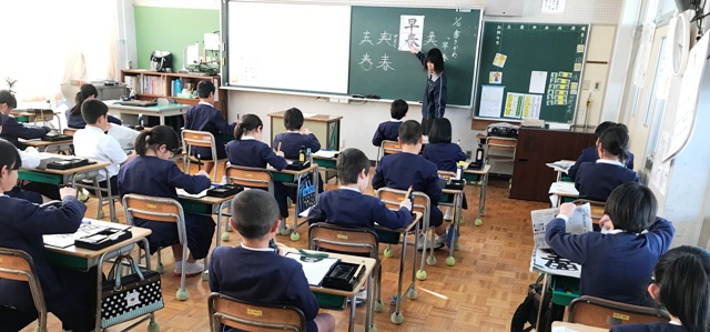 1月12日(金) 10日(水)の5・6校時 4年生が、書き初めで「早春」を書きました。事務職員の西村先生が、師範の免許を持っているということで、ゲストティーチャーとして少し協力してもらいました。写真は、そのときの様子です。