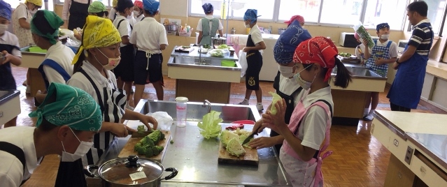 6月8日(木)2時間目 5年生の家庭科で、「カラフルコンビネーションサラダ」作りが行われていました。女子と男子が協力して、楽しく活動していました。