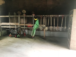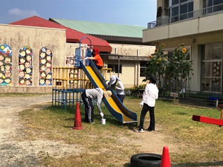 7月25日(水) 職員作業を行いました。農具倉庫の片付け、ジャングルジムと滑り台のペンキ塗り、ウサギ小屋のネット張りです。熱中症を心配しながらみんな汗びっしょりになって行いました。農具倉庫は見違えるほどきれいになりました。