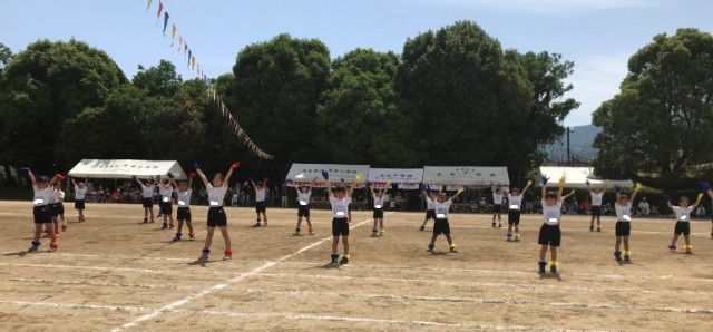 5月27日(日) 低学年の表現運動です。子供達は、軽快なリズムに合わせて楽しそうに踊っていました。左右色の違う手袋と足につけたリボンがアクセントになっていました。