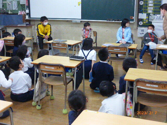 保護者の方が養護教諭の話を聴いている間、新入生は1年生が用意した松ぼっくりで作ったおもちゃや紙相撲を使って楽しく遊んでいました。1年生がお兄さん、お姉さんぶりを発揮し大活躍でした。