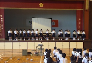 今日の児童集会で2年生が音読発表をしました。「わたしと小鳥と鈴と」の金子みすずさんの詩と「回文」の音読をしてくれました。とても上手に元気な声で音読をしてくれました。とても上手でした。