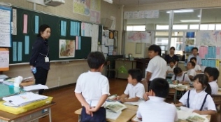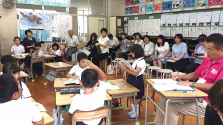 6月22日(木) 5校時に2年生国語「スイミー」の研究授業がありました。この授業は、玉名・荒尾の教育会の事業の一環で行われたものです。多くの先生方の参観の中で行われました。子ども達は、班での活動に一生懸命取り組んでいました。