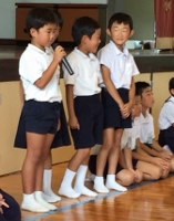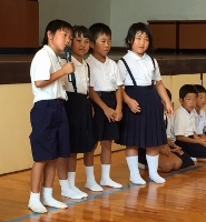 7月21日(金) 1校時 夏休み全校集会で学級代表の子供達が、4月から7月までを振り返って発表をしました。がんばったことと、夏休みにがんばりたいことです。みんな自分を成長させるために、自分で考え振り返り、めあてを考えていました。成長が楽しみです。