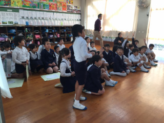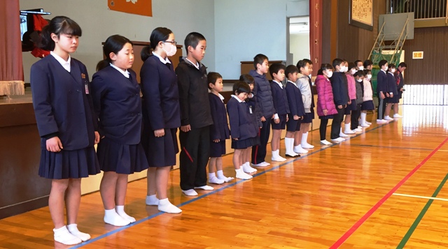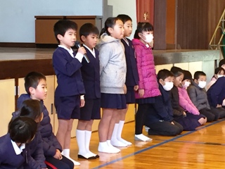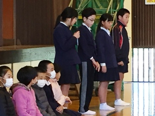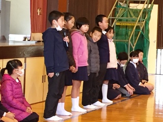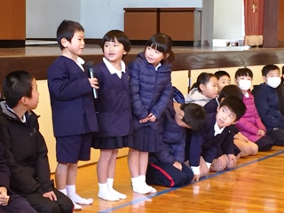 子どもたちも学級代表の子どもたちが、それぞれ、後期前半に頑張ったことと後期後半に頑張りたいことを発表してくれました。頑張ったことは、持久走や陸上記録会についてが多かったです。頑張りたいことでは、勉強や家の手伝い、中には弟妹の面倒を見るといった目標を立てている子もいました。写真は、発表している子どもたちです。