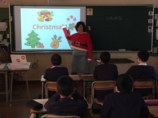 12月18日(月) 4校時 5年生で外国語活動がありました。今日は、モーガン先生による外国のクリスマスの様子の学習でした。モーガン先生は雰囲気を出すためにサンタの格好をして登場されました。子どもたちも喜んでいました。モーガン先生は2.5mぐらいのツリーを飾っているという話にみんな驚いていました。後半は、ゲームで楽しみました。