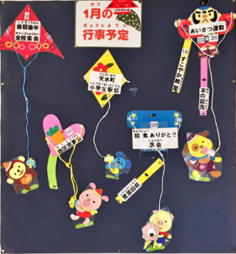 12月31日(日) 今年もあと12時間あまりで終わります。大変お世話になりました。来年もどうぞよろしくお願いします。写真は、校内に掲示してある1月の行事予定です。今は、お正月といっても以前のような雰囲気は感じられなくなってきていますが、この掲示物は、昔ながらのお正月のイメージを持っています。