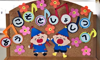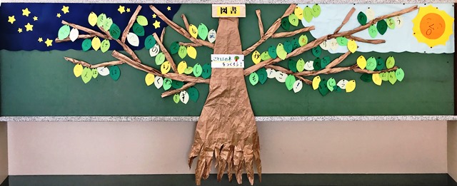 ご紹介します。一つは、子供達が木の葉に書いた文字を使って図書委員が作成した言葉の木です。後の二つは、子供達を図書室へ誘う掲示物です。