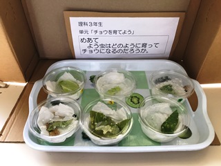 5月29日(火) 理科室前にモンシロチョウの学習に関する工夫がありました。子供達は、幼虫や虫が大好きです。この時期に幼虫を育てる活動は、とてもよい経験になると思います。