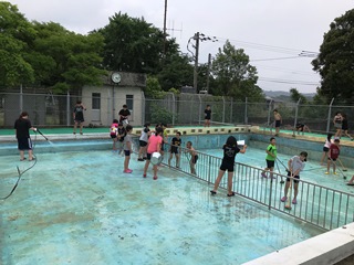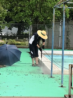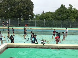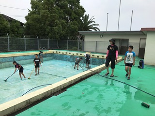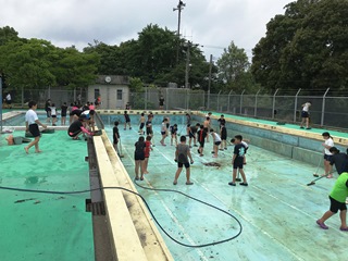 5月31日(木) 今日の5校時は、56年生によるプール掃除を行いました。事前に高圧洗浄機を使用した後、プールサイドやプールの底を中心に取り組みました。1時間という短い時間でしたが、とてもきれいになりました。
