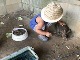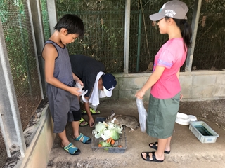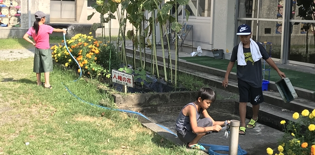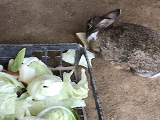 8月7日(火) 夏休みも子供達が、飼育当番や水掛をしてくれています。今日は,3人の子供達が、お世話をしていました。いつもありがとうございます。ウサギもうれしそうにえさを食べていました。