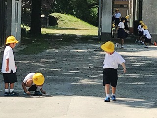 8月30日(木)の昼休みです。1年生の男の子達が、汗びっしょりになって虫取りをしていました。途中で鳩の巣を発見し大騒ぎとなっていました。虫かごの中には、3匹のバッタが入っています。