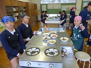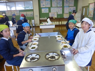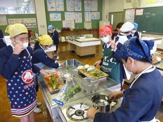 11月27日(火) 今日は、6年生が家庭科「任せてね今日の食事」の授業で、「ジャーマンポテト」「野菜のベーコン巻き」「青葉とちくわのごま風味炒め」の3つの料理から選んで作りました。担任曰く、今日の料理のできが良くとてもおいしかったということです。