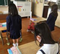 1年生は、学校の決まりの学習で並び方や廊下の歩き方を勉強していました。